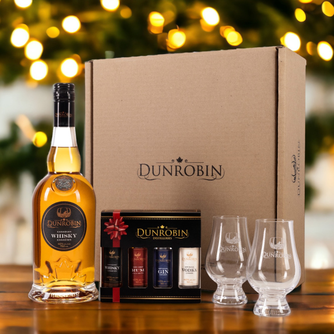 Embrace the spirit of giving with a bottle of our award-winning Canadian Whisky, accompanied by an ensemble of four exquisite mini bottles, ensuring a diverse tasting experience that transcends ordinary indulgence. Elevate the ritual of savouring fine whisky with two authentic Glencairn crystal glasses, sourced directly from the heart of Scotland, where craftsmanship meets heritage.
